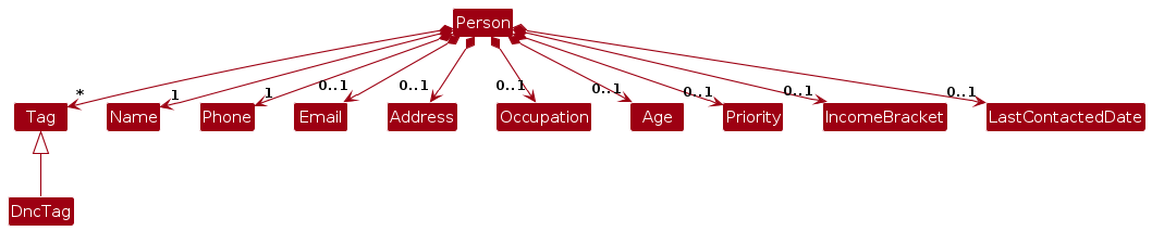 edit command, allowing users to update contact information as needed.DncTag for "Do Not Call" compliance.Note: An alternative (arguably, a more OOP) model is given below. It has a Tag list in the AddressBook, which Person references. This allows AddressBook to only require one Tag object per unique tag, instead of each Person needing their own Tag objects.