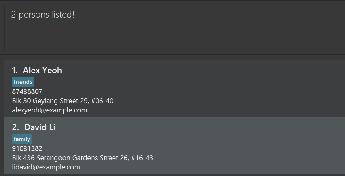 Add | add n/NAME p/PHONE_NUMBER e/EMAIL a/ADDRESS [t/TAG]…​ e.g., add n/James Ho p/22224444 e/jamesho@example.com a/123, Clementi Rd, 1234665 t/friend t/colleague |